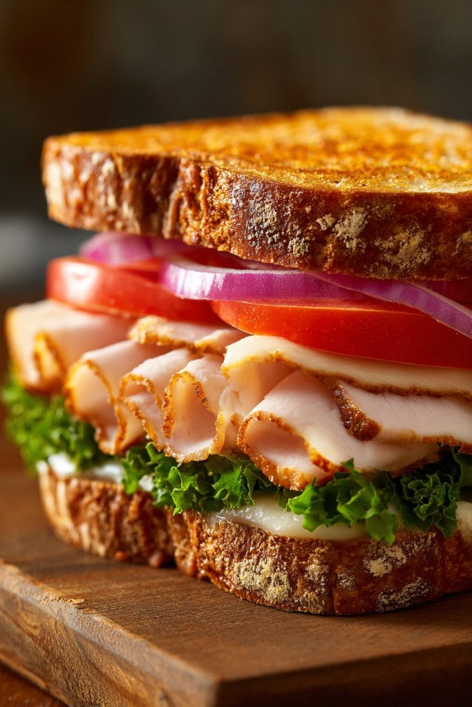 When dealing with particularly juicy tomatoes that threaten to make your sandwich soggy, take an extra minute to remove the seeds and gelatinous interior before slicing. Simply cut the tomato in half horizontally and use your finger or a small spoon to scoop out the watery seed pockets. This small step preserves that fresh tomato flavor while eliminating excess moisture that would otherwise compromise your bread’s texture. If you’re making multiple sandwiches for the family, set up an assembly line system: lay out all bread slices, spread all condiments, then move through each ingredient category systematically. This approach cuts your active time nearly in half compared to building each sandwich individually from start to finish. For even more flavor depth without additional work, consider mixing your mayonnaise and mustard together before spreading – this creates a unified sauce that distributes both flavors evenly throughout every bite. When selecting turkey, look for thicker-sliced options from the deli counter rather than pre-packaged thin slices, as they hold up better to the other ingredients and provide more substantial texture. If you have picky eaters who object to visible vegetables, you can finely chop the lettuce and onions and mix them into the mayonnaise before spreading – they’ll get the nutritional benefits without the texture objections. For those really hectic nights, you can prep components in advance: wash and dry lettuce leaves, slice tomatoes and onions, and even mix your spreads, storing everything in separate containers in the refrigerator for quick assembly when hunger strikes. If your bread tends to get overly crunchy in the toaster, try using the “light” setting and then finishing with a quick 30-second toast in a dry skillet – this gives you control over the exact crispness level you prefer. Remember that sandwich building is forgiving – if something doesn’t look perfect, it will still taste wonderful, so don’t stress about achieving magazine-worthy presentation when you’re just trying to get dinner on the table.
