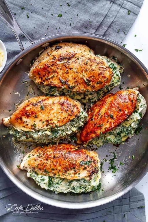 4. Divide the spinach-artichoke mixture evenly among the 4 chicken breasts, stuffing it firmly into the pockets.