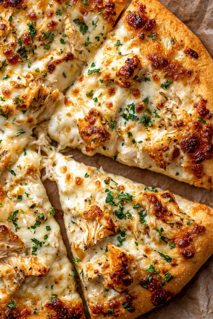This chicken Alfredo pizza combines creamy homemade sauce, tender chicken, and melted cheeses on a crispy crust for the ultimate comfort food fusion that will become a family favorite.
