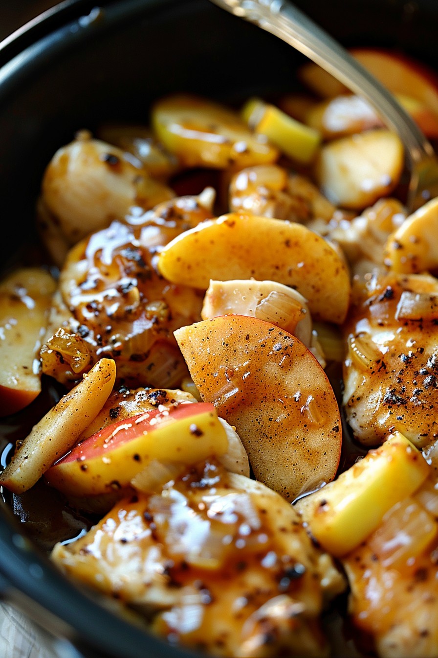 - The slow cooker does all the work, infusing the chicken with apple flavors over several hours.