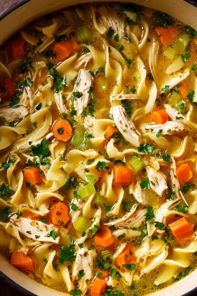 Absolutely! For a stovetop version, sauté the onions, garlic, carrots, and celery in a large pot with a tablespoon of oil for 5 minutes. Add the chicken, broth, and seasonings, bring to a boil, then simmer covered for 20-25 minutes until chicken is cooked. Shred the chicken, return it to the pot, add noodles, and cook for another 8-10 minutes until noodles are tender. It’s faster but requires more attention.
