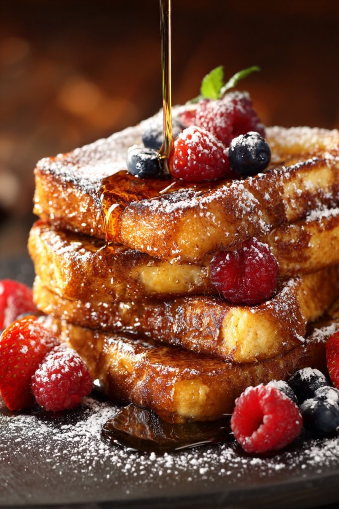 Arrange two slices of your perfectly cooked cinnamon French toast on each warmed plate, creating a slight overlap for visual appeal. Dust generously with confectioners’ sugar using a fine-mesh sieve, creating a snowy landscape effect that contrasts beautifully with the golden-brown surface. Drizzle with pure maple syrup in a zigzag pattern, allowing the amber liquid to pool around the edges while some soaks into the bread’s porous structure. Scatter a handful of fresh berries around the plate—raspberries, blueberries, and sliced strawberries provide both color contrast and acidic balance to the rich, spiced bread. For those seeking authentic Parisian café presentation, add a sprig of fresh mint beside the berries, creating that touch of green that makes the entire composition sing. Serve immediately while the French toast maintains its textural contrast between crisp exterior and custardy interior, capturing that magical moment when temperature, texture, and flavor exist in perfect harmony, much like the best breakfast experiences from Copenhagen to Istanbul.
