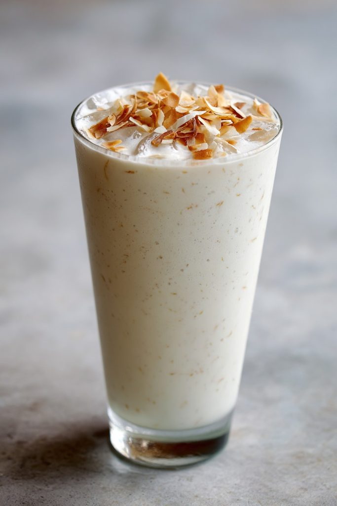 Pour the freshly blended coconut milkshake into chilled tall glasses, dividing it evenly between two servings to ensure consistent flavor and nutritional balance. The immediate serving is crucial because the natural ingredients begin to separate slightly over time, and the ice crystals will continue to melt, potentially altering the ideal texture you’ve achieved through careful blending. For an extra touch of presentation and added texture, you might sprinkle a small amount of reserved toasted coconut on top of each serving. The consumption of this nutrient-dense beverage shortly after preparation ensures you receive maximum benefits from the vitamins, minerals, and healthy fats that can be sensitive to oxidation and temperature changes. Enjoy this milkshake as a satisfying snack or meal replacement that provides sustained energy from its balanced macronutrient profile.