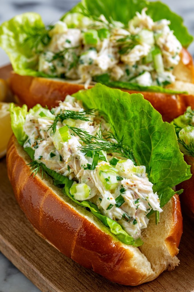 Now for the main event – bringing all these elements together in a symphony of sandwich perfection. Take your slightly cooled toasted buns and line each one with a butter lettuce leaf, creating a protective barrier between the bread and the crab mixture (this prevents sogginess and adds extra crunch). Using an ice cream scoop or large spoon, generously fill each bun with your chilled crab mixture, mounding it slightly in the center for that picture-perfect look. Don’t be shy here – this isn’t the time for portion control. The filling should be piled high enough that you might need to eat it with a fork for the first few bites, but not so overflowing that it creates a seafood avalanche on your plate. Garnish with extra fresh herbs if you’re feeling fancy, and serve immediately with lemon wedges on the side for that extra zesty punch.