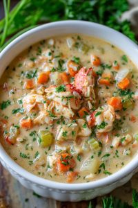I always start this soup the way Grandma taught me – by melting the butter in my heaviest stockpot over medium heat until it foams gently, watching it carefully because burned butter can’t be saved, much like precious family moments. When the butter is ready, I add the diced onion, celery, and carrots, stirring them with my wooden spoon until they glisten with that golden butter coating. The kitchen fills with that magical aroma of cooking vegetables that takes me right back to standing on my tiptoes watching Grandma work her magic. I cook them slowly, stirring occasionally, for about 8-10 minutes until the onions turn translucent and the carrots begin to soften around the edges, but never letting them brown because patience yields the sweetest flavors. This slow cooking releases the natural sugars in the vegetables, creating the foundation that makes this soup taste like home.