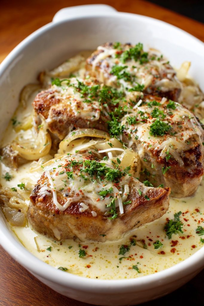You can certainly do some advance preparation to make dinner time smoother—the pork chops can be seasoned and refrigerated up to eight hours ahead, and the onions can be sliced in advance. However, I don’t recommend fully assembling and refrigerating the complete dish before baking, as the sauce can separate when reheated. What works beautifully is searing the pork chops and preparing the sauce base (through adding the chicken broth), then refrigerating these components separately. When ready to serve, gently reheat the sauce, add the cream cheese, then proceed with the recipe as written. This method preserves the fresh, vibrant quality of the dish while still saving precious time during the busy dinner hour.