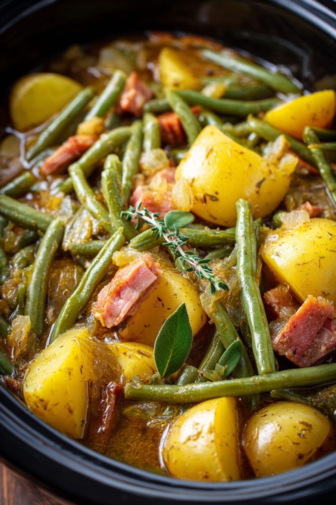 If you find yourself with an abundance of garden-fresh green beans, this recipe freezes beautifully—just portion the cooled dish into freezer-safe containers and it’ll keep for up to three months. When reheating from frozen, let it thaw overnight in the refrigerator before warming gently on the stove top to preserve the texture of the vegetables. For those who prefer their green beans with more bite, you can add them during the last two hours of cooking rather than at the beginning—this little adjustment makes a world of difference in texture. If your potatoes seem to be cooking faster than your green beans, try cutting the potatoes slightly larger next time or using a variety that holds its shape well during long cooking, like red potatoes or fingerlings. When summer gardens are overflowing, feel free to add other vegetables to the mix—sliced carrots, fresh corn cut from the cob, or even some chopped celery can make wonderful additions that celebrate the season’s bounty. For a creamier version, during the last thirty minutes of cooking, stir in half a cup of heavy cream or whole milk and let it warm through gently—this creates a luxurious sauce that coats the vegetables beautifully. If you’re watching your sodium intake, you can use low-sodium chicken broth and reduce or omit the added salt—the natural flavors of the vegetables and smoked meat will still provide plenty of taste. Don’t discard that flavorful cooking liquid after serving—it makes an excellent base for soups or can be used to cook rice or grains, infusing them with all those wonderful vegetable and herb notes.
