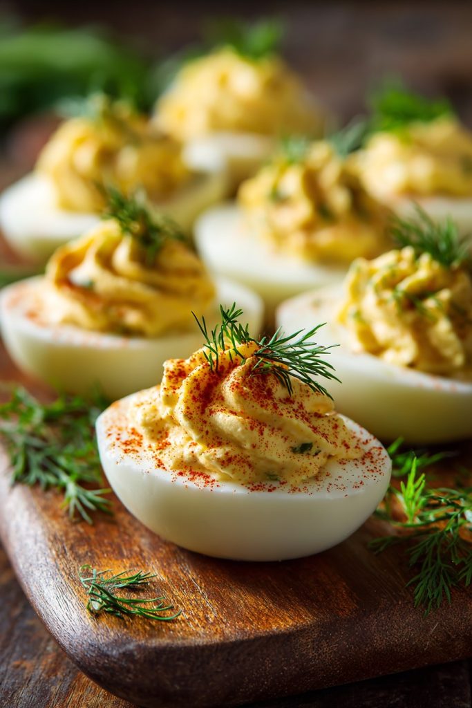 Arrange your 24 egg white halves on a serving platter, ensuring they’re stable and won’t tip over when filled. If using a piping bag, fit it with a star tip and fill with the yolk mixture, then pipe generous swirls into each egg white half for an elegant presentation. Alternatively, use a small spoon to carefully mound the filling into each cavity, smoothing the top with the back of the spoon. Lightly dust the filled eggs with smoked paprika using a small sieve for even distribution—this not only adds visual contrast but also provides a subtle smoky flavor that complements the dill beautifully. Finish with small sprigs of fresh dill placed strategically on each deviled egg, creating an appealing presentation that hints at the flavors within. For optimal food safety and texture, cover loosely with plastic wrap and refrigerate for at least 30 minutes before serving to allow the flavors to fully harmonize.