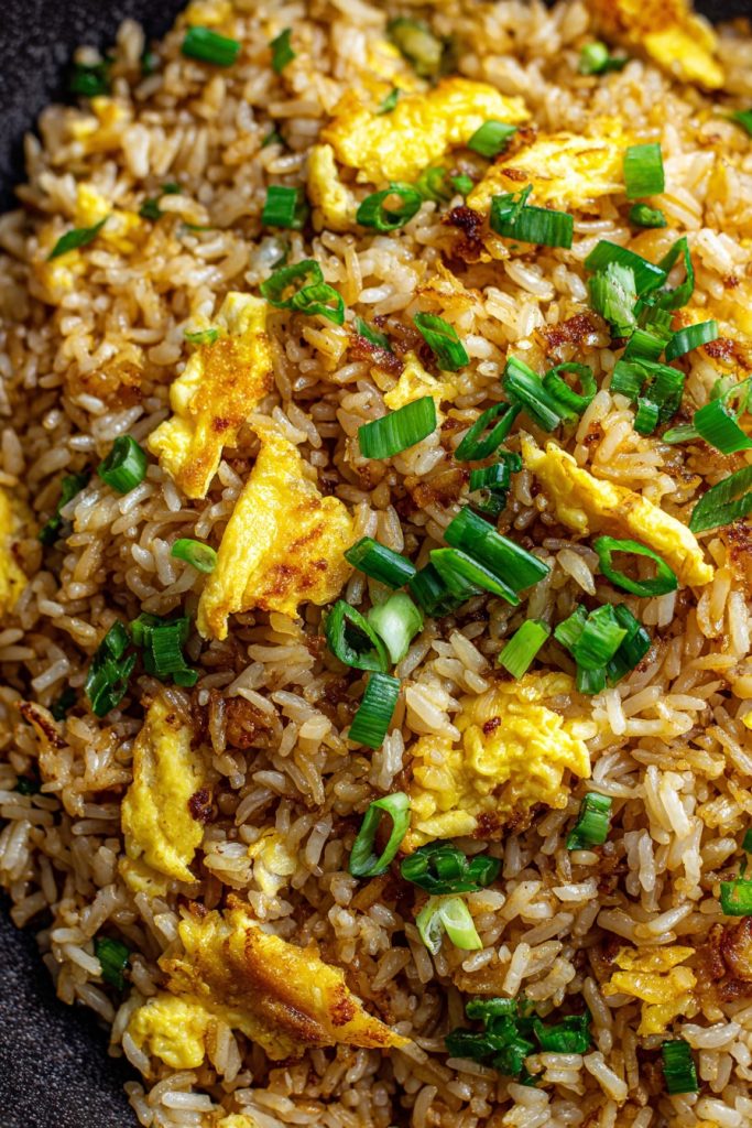 Reduce the heat to medium and add the unsalted butter to the perimeter of the wok, allowing it to melt and foam before incorporating it into the rice mixture through gentle folding motions. Continue cooking for an additional two minutes, during which the butter will emulsify with the existing oils and coat each rice grain with a rich, glossy sheen. Test for seasoning adjustment by tasting a small sample from the center of the wok where heat distribution is most even, adding additional salt if necessary but being mindful of the salted garlic chips that will be added later. Transfer the finished rice to a serving platter, creating a slight mound in the center to maximize surface area for garnishing. Distribute the reserved garlic chips evenly across the top, followed by the chopped scallions, serving immediately to preserve textural contrasts.