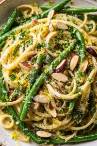 Divide the pasta between two warmed bowls, twirling the linguine into elegant nests that cradle the green beans and almonds. Sprinkle with the remaining Parmesan, parsley, and lemon zest, creating visual appeal that promises the complex flavors within. Drizzle with a final thread of extra virgin olive oil for added richness and shine. Serve immediately while still warm, as this dish celebrates the beauty of the present moment – the steam rising like whispered promises, the colors vibrant with life, the aromas inviting intimacy and connection. This is more than mere sustenance; it is an edible love letter, a culinary embrace that nourishes both body and soul.