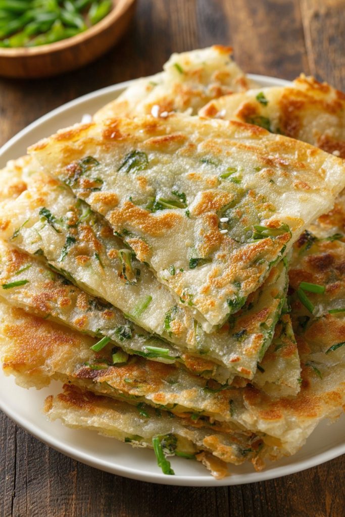 As each pancake finishes cooking, transfer it to a cutting board and use a sharp knife or pizza cutter to slice it into wedges—I find 6-8 wedges per pancake works well for sharing. Serve immediately while still hot and crispy, as these are truly at their peak texture right out of the pan. The exterior should be delightfully crisp while the interior remains tender and flaky, with the green onions providing bursts of fresh flavor throughout. If you need to keep multiple batches warm while cooking the rest, place them on a baking sheet in a 200°F oven—they’ll maintain their crispness much better than if covered with foil, which can trap steam and make them soggy. These are fantastic on their own or served with a simple dipping sauce of soy sauce mixed with a splash of rice vinegar.