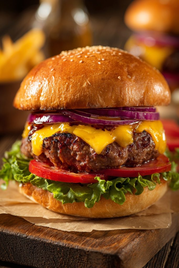 Now comes the sacred act of assembly—begin by spreading the signature sauce generously on the bottom half of each toasted brioche bun, creating a foundation that will catch every precious drip. Place a crisp lettuce leaf atop the sauce, followed by a slice of ripe tomato at its peak, then a few whisper-thin slices of red onion that provide just enough sharpness to balance the richness. Carefully place your perfectly cooked burger patty with its melted cheese blanket atop this vegetable throne, then crown it with the top bun that you’ve also spread with the remaining sauce. Press down gently—just enough to bring all elements into contact without compressing the beautiful architecture you’ve created. Tip: Let the assembled burgers rest for two minutes before serving—this allows the heat to gently warm the vegetables and meld the flavors, creating a cohesive experience where every component feels intentionally placed and perfectly balanced.