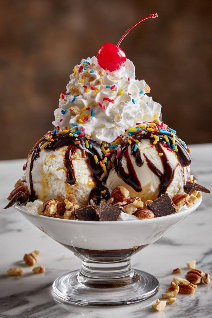 - The Rocky Road Rendezvous: Swap vanilla ice cream for chocolate, use only hot fudge sauce, add mini marshmallows and chopped almonds instead of pecans, and garnish with chocolate chips. This variation turns your sundae into a textural adventure that’s like hiking through edible topography—every spoonful reveals new chocolatey landscapes and marshmallow clouds.
