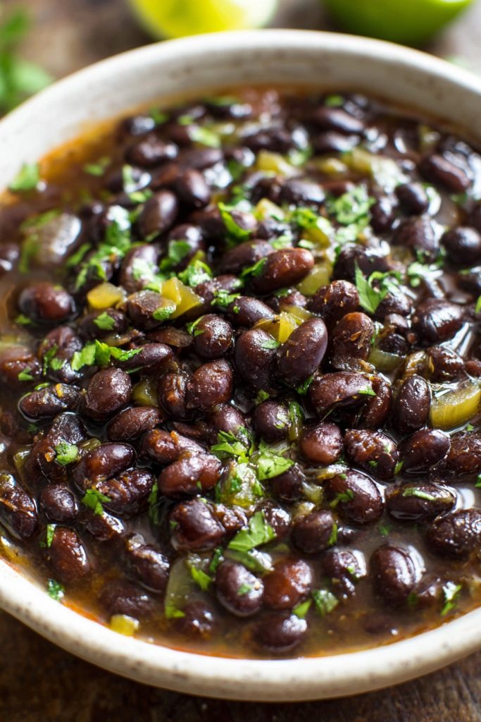 Remove the bay leaf, which has now completed its work of imparting its subtle floral notes, and stir in the fresh lime juice, watching as it brightens the entire dish and lifts all the flavors to new heights. Taste your creation and adjust the seasoning if needed, perhaps adding another pinch of salt or squeeze of lime to perfectly balance the earthy beans with bright acidity. Gently fold in the chopped fresh cilantro, letting its vibrant green leaves speckle the dark beans like stars appearing in the evening sky, adding both visual beauty and fresh herbal notes. Allow the beans to rest for five minutes before serving, during which time the flavors will continue to meld and deepen, creating that magical alchemy that turns simple ingredients into something truly extraordinary. Tip: The beans will thicken as they cool, so if you prefer a soupier consistency, stir in a bit more broth or water until it reaches your desired texture.