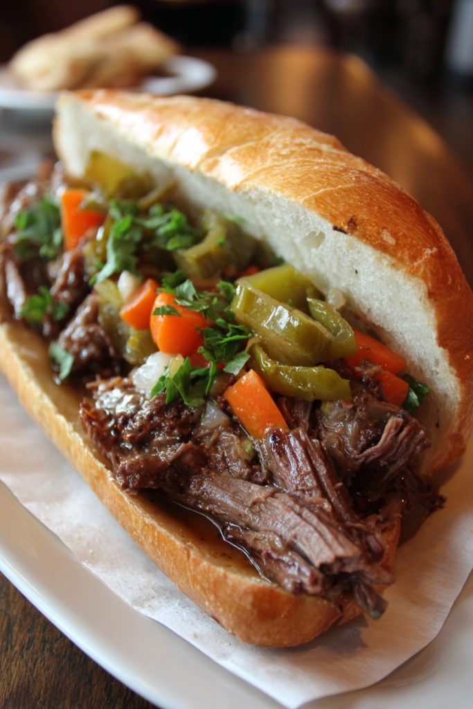 This Chicago-style Italian beef sandwich achieves perfection through precise technique: proper searing develops foundational flavors, controlled braising ensures tenderness, and careful assembly preserves textural integrity. The harmonious balance of rich beef, vibrant giardiniera, and crusty bread creates an unforgettable culinary experience worthy of any professional kitchen.