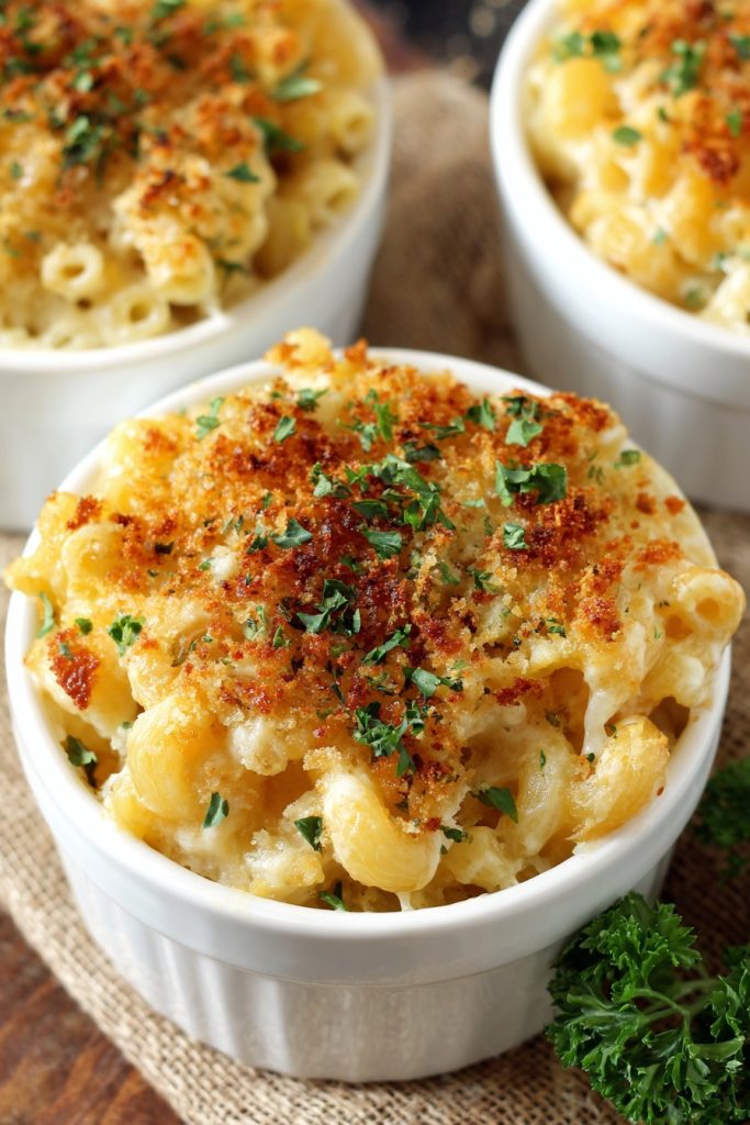 Gently fold the cooked elbow macaroni into your magnificent cheese sauce until every single piece of pasta is completely enveloped in that glorious cheesy goodness—take your time here to ensure even distribution throughout. In a small bowl, combine the 1/2 cup panko breadcrumbs with the 2 tablespoons of melted butter and 1 tablespoon of chopped fresh parsley, mixing until the breadcrumbs are evenly coated and ready to create that irresistible crunchy topping. Divide the mac and cheese mixture evenly among your 6 prepared ramekins, filling them about 3/4 full to allow room for expansion during baking. Sprinkle the buttered panko mixture evenly over the top of each ramekin, creating a generous layer that will transform into that golden, crispy crust you’ve been dreaming about. Place the filled ramekins on a baking sheet to catch any potential bubbling over and make transferring them in and out of the oven much safer and easier.