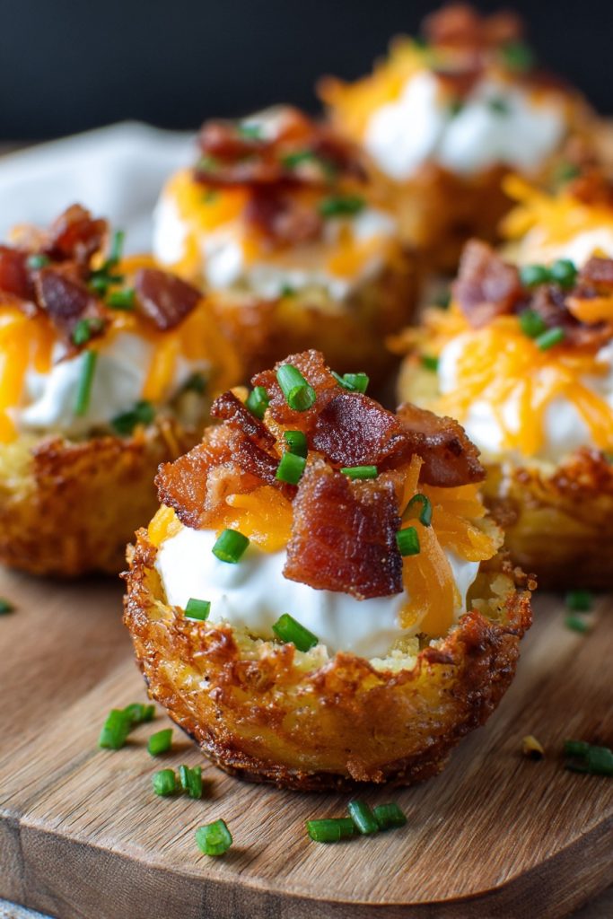 Absolutely, and this is one of their greatest advantages for stress-free entertaining! You can prepare these glorious potato cups through the second baking stage up to 24 hours in advance. Once they’ve completed their second crisping in the oven, allow them to cool completely to room temperature, then store them in an airtight container in the refrigerator. When you’re ready to serve, simply arrange them on a baking sheet and warm them in a 350°F oven for 5-7 minutes until they’re heated through but still maintain their perfect crispy texture. Then proceed with adding your toppings as directed. The toppings themselves can also be prepped in advance—have your bacon cooked and crumbled, cheese shredded, and chives chopped so assembly becomes a quick and effortless process right before your guests arrive.