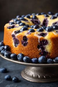 Place the cake in the preheated 350°F oven and bake for 45-55 minutes, rotating the pan halfway through the baking time to ensure even browning. The cake is ready when the edges pull slightly away from the pan sides, the top springs back when gently pressed, and a toothpick inserted into the center comes out with just a few moist crumbs (but no wet batter). The internal temperature should register between 200-205°F on an instant-read thermometer for optimal doneness. Professional Tip: Oven temperatures can vary significantly, so using an oven thermometer ensures accuracy. If the top begins browning too quickly after 30 minutes, tent loosely with aluminum foil to prevent over-browning while the center continues cooking. The wild blueberries may release some juice during baking, which is normal and contributes to the cake’s moisture.