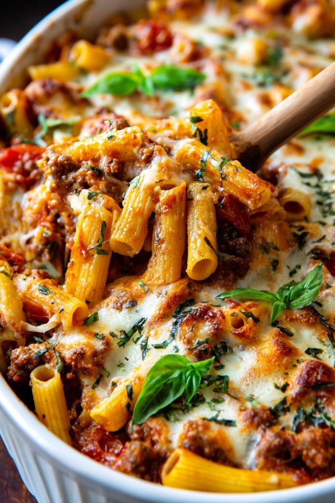 - Chicken Alfredo Twist: Replace the ground beef with 1 pound of diced boneless, skinless chicken thighs and use Alfredo sauce instead of marinara. Use 4 cups of chicken broth as usual but omit the diced tomatoes, and add 1 cup of frozen peas during the last 10 minutes of baking. Top with a mix of mozzarella and provolone cheeses for a creamy, comforting white sauce version that kids particularly love.