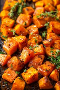Remove the baking sheet from the oven and immediately transfer the roasted sweet potatoes to a clean serving bowl using a heat-resistant spatula, taking care to preserve the delicate caramelized crust that has developed. While the potatoes are still hot, evenly distribute 1½ teaspoons of kosher salt, ½ teaspoon freshly ground black pepper, 2 teaspoons fresh thyme leaves, and 1 teaspoon smoked paprika across the surface. Employ a gentle folding technique to incorporate the seasonings without crushing the tender cubes, ensuring each piece receives balanced flavor distribution. The residual heat will gently toast the herbs and bloom the paprika’s smoky characteristics without burning delicate compounds. Pro Tip: Season in stages rather than all at once, tasting after each addition to achieve perfect balance without overwhelming the potatoes’ natural sweetness.