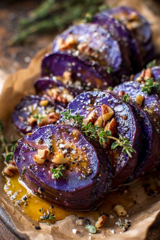Selecting the perfect purple sweet potatoes is an art form—look for specimens that feel heavy for their size with smooth, taut skin and no soft spots or blemishes. The color should be consistently deep purple throughout, though some natural variation is normal. When storing them before use, keep them in a cool, dark place but never refrigerate raw sweet potatoes as the cold temperatures can alter their texture and flavor profile. For the most dramatic color presentation, consider leaving the skins on—they become wonderfully crispy during roasting and add beautiful visual contrast. If you prefer peeling them, use a vegetable peeler and work quickly as the flesh can oxidize slightly when exposed to air. When melting your coconut oil, do so gently over low heat or in short bursts in the microwave—overheating can destroy the delicate flavor compounds and reduce its nutritional benefits. For an extra flavor dimension, consider infusing your coconut oil with garlic or herbs before brushing it onto the potatoes. The roasting time may vary slightly depending on your specific oven and the thickness of your potato slices, so always rely on the fork test rather than strictly following the timer. If your potatoes are browning too quickly on the bottom but aren’t yet tender inside, simply move them to a higher rack in your oven and reduce the temperature by 25 degrees. For meal prep enthusiasts, these roasted purple sweet potatoes store beautifully in airtight containers for up to 4 days and reheat wonderfully in a 350°F oven for 10-12 minutes. The pecans can be toasted in advance—spread them in a single layer on a baking sheet and toast at 350°F for 5-7 minutes until fragrant, watching carefully to prevent burning. If you’re serving these for a special occasion, consider garnishing with edible flowers or microgreens for an extra touch of elegance that will make your guests feel truly special.