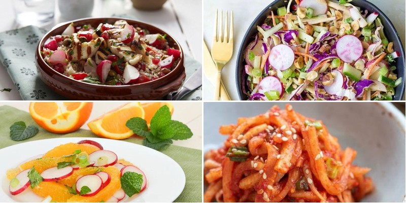 - Combine the sliced radishes and julienned apples in a large serving bowl, gently tossing with your hands to distribute evenly.