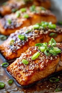 Take your salmon teriyaki from great to absolutely extraordinary with these professional techniques that will elevate your cooking game to new heights. For the most incredible texture and flavor, always purchase fresh salmon rather than frozen – look for firm, bright flesh with no fishy odor and visible marbling throughout. If you must use frozen salmon, thaw it slowly in the refrigerator overnight rather than using quick-thaw methods that can compromise texture. When making your teriyaki glaze, consider using mirin instead of rice vinegar for a more authentic Japanese flavor profile – the subtle sweetness and complexity will make your sauce truly exceptional. For those who love extra caramelization, try broiling the salmon for the final 1-2 minutes after searing to create an even more dramatic glaze crust that crackles with flavor. If you’re watching your sugar intake, you can reduce the brown sugar to 2 tablespoons and increase the honey slightly – the honey provides sweetness while helping create that beautiful glossy finish. For maximum flavor penetration, you can marinate the salmon in half the teriyaki sauce for up to 30 minutes in the refrigerator, but never longer as the acid can begin to cook the fish. When cooking multiple fillets, don’t overcrowd the pan – cook in batches if necessary to ensure each piece gets proper searing and caramelization. For an extra flavor boost, add a tablespoon of orange juice or pineapple juice to your teriyaki sauce – the natural acidity and fruit notes complement the salmon beautifully. Always use fresh ginger rather than powdered – the vibrant, aromatic quality of fresh ginger makes a noticeable difference in the final flavor profile. If your sauce becomes too thick, simply thin it with a tablespoon of warm water until it reaches your desired consistency. For food safety, never reuse marinade that has touched raw fish unless you bring it to a rolling boil for at least one minute first.