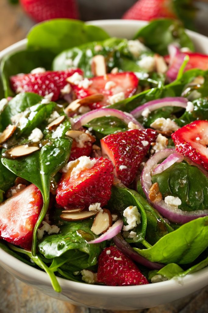 When selecting strawberries for this salad, look for berries that are uniformly red without white shoulders near the stem – they’ll be sweeter and more flavorful. If your strawberries aren’t quite ripe enough, you can macerate them by tossing the sliced berries with a teaspoon of sugar and letting them sit for 10-15 minutes before adding to the salad. This draws out their natural juices and enhances their sweetness. For the spinach, baby spinach works best because the leaves are more tender and less bitter than mature spinach, but if you only have regular spinach, remove the tough stems and tear larger leaves into bite-sized pieces.
