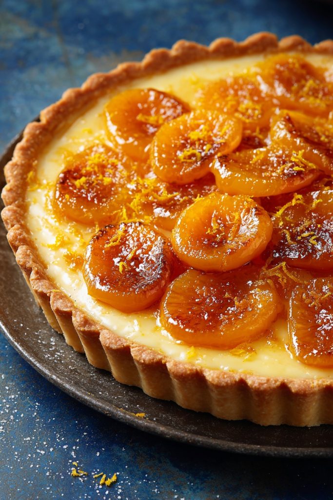 For the most intense orange flavor imaginable, seek out blood oranges or Cara Cara oranges when they’re in season—their complex, berry-like undertones and vibrant crimson flesh will transform this tart into an absolute showstopper that will have your guests talking for weeks. The natural variations in these specialty oranges create stunning visual patterns in your finished tart, with each slice becoming a unique work of edible art that photographs beautifully for your social media feeds. When zesting your oranges, be absolutely meticulous about avoiding the bitter white pith beneath the colorful outer skin—use a light touch and rotate the fruit frequently to capture only the aromatic oil-rich zest that contains the true essence of orange flavor. For an extra flavor boost, consider steeping the orange zest in the heavy cream for 30 minutes before making the filling—this simple extra step allows the citrus oils to infuse more deeply into the dairy base, creating layers of flavor that unfold gradually with each bite. If your orange slices release too much juice during baking and make the filling slightly watery, try pre-baking them on a parchment-lined sheet at 300°F for 15 minutes to concentrate their flavor and reduce excess moisture—this professional technique ensures your tart maintains perfect structural integrity. For the most spectacular caramelization on your orange topping, use a kitchen torch during the final minutes of baking to spot-caramelize any areas that need more color—this controlled approach prevents over-baking the delicate filling while achieving that professional bakery-style finish. When measuring your flour, always use the spoon-and-level method rather than scooping directly from the bag—this ensures accuracy and prevents a dense, tough crust that can ruin the delicate textural balance of your finished tart. For an extra flavor dimension that will surprise and delight your guests, add a tablespoon of Grand Marnier or Cointreau to the filling—the orange liqueur enhances the citrus notes while adding sophisticated alcoholic warmth that makes this dessert feel truly special occasion-worthy.